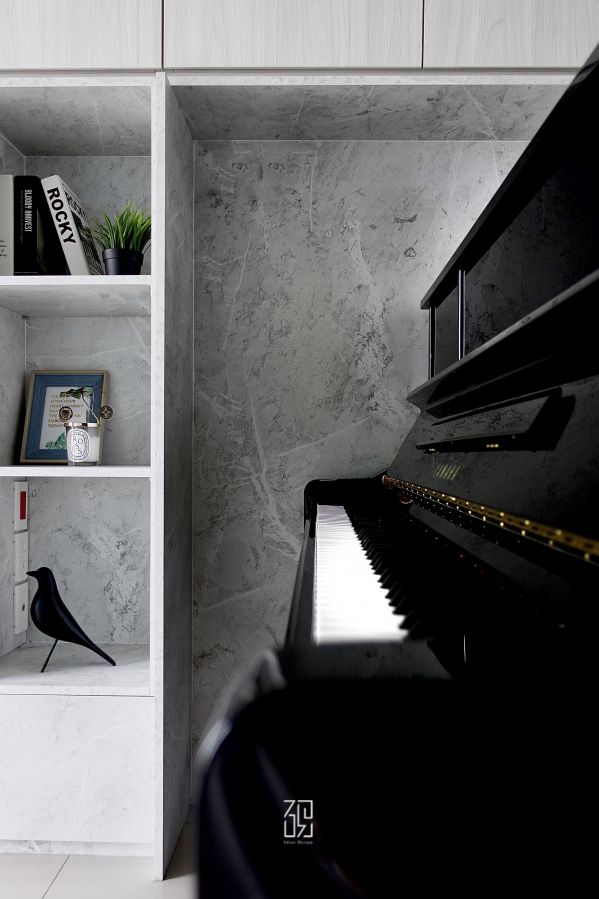 設計師在客廳區域利用大理石紋、灰白色調來規劃公領域的整體色調,打造屋主所喜歡的明亮氣質氛圍,以隔板規劃出屬於鋼琴的位置,讓身為鋼琴老師的屋主方便使用,且區隔出進門的玄關。除了客廳大量的櫃體,在用餐區也設計了不同收納功能的櫃體,餐邊櫃的規劃也體貼屋主的使用習慣,可放置咖啡機等器具,使用上方便且優雅。整體空間透過色調來體現舒適的明亮感,以吊燈、大理石、層板的造型提升氣氛和質感,在臥室空間更選擇了沉靜高雅的淡紫色,寧靜別緻的營造出整體氛圍,整體為屋主打造符合需求和風格的空間設計。