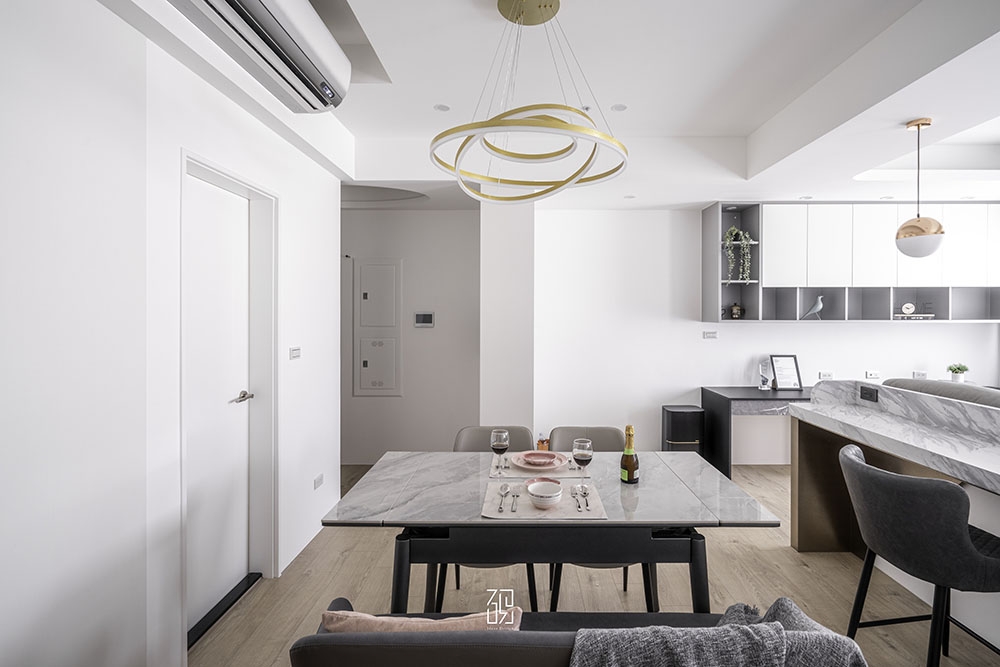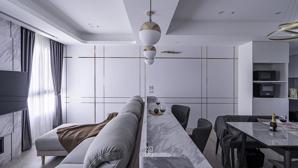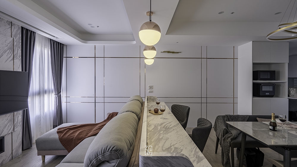 沙發後面的吧台和金色吊燈也是客廳設計的亮點。吧台以白色大理石台面為主,搭配金色金屬框架,既美觀又實用。屋主夫婦喜歡在吧台上享受早餐或與朋友小聚,這樣的設計讓他們的生活更加便利和愜意。金色吊燈則選用了水晶材質,散發出柔和而華麗的光芒,讓整個空間顯得非常奢華和有品位。吊燈的高度和位置也經過了精心的設計,既不會影響到吧台的使用,又能夠充分展示其美感。