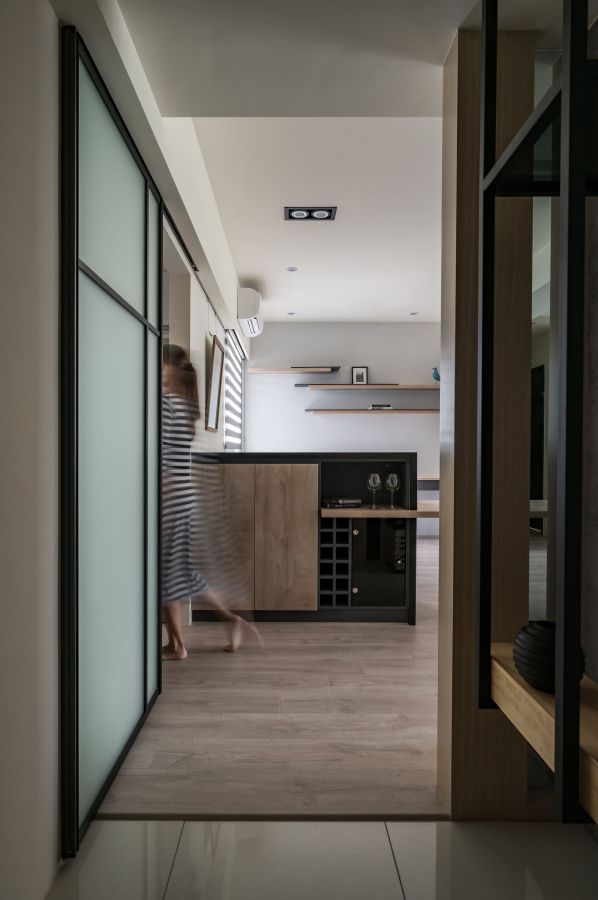 設計靈感源自於日式概念,取天然石材與淺色木質作為空間基底,在無彩度中增添溫暖特質。內部公共空間無隔牆的開放設計,讓空間具有流動、穿透性。強大的靈活度,讓屋主得以隨心所欲創造出獨有生活風貌,不被結構制約。此外,利用廚房的封閉設計,使餐廳與書房共居一室,少了油煙與客廳的喧鬧,多了寧靜與清閒之心。加入鐵件映襯鐵灰色石材,少許的工業風細節及日式質感,讓空間自成一格並呈現出開創性。