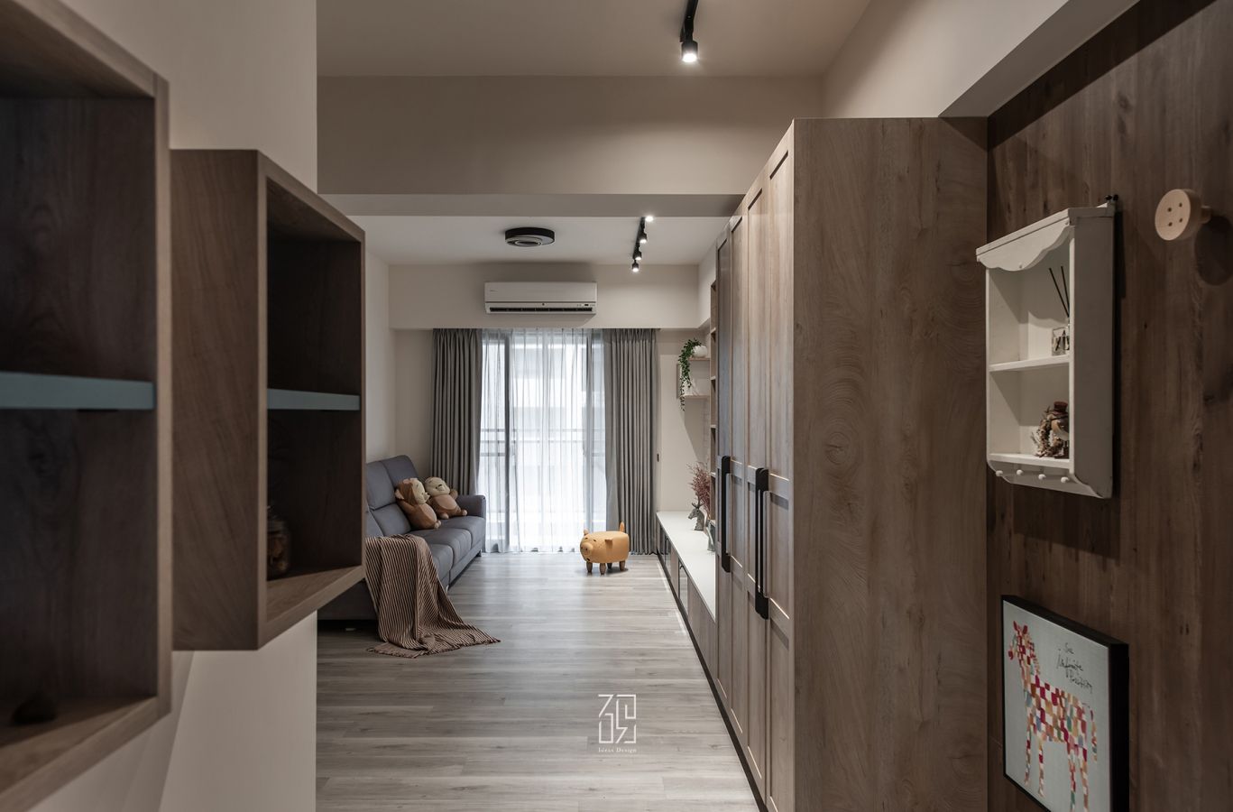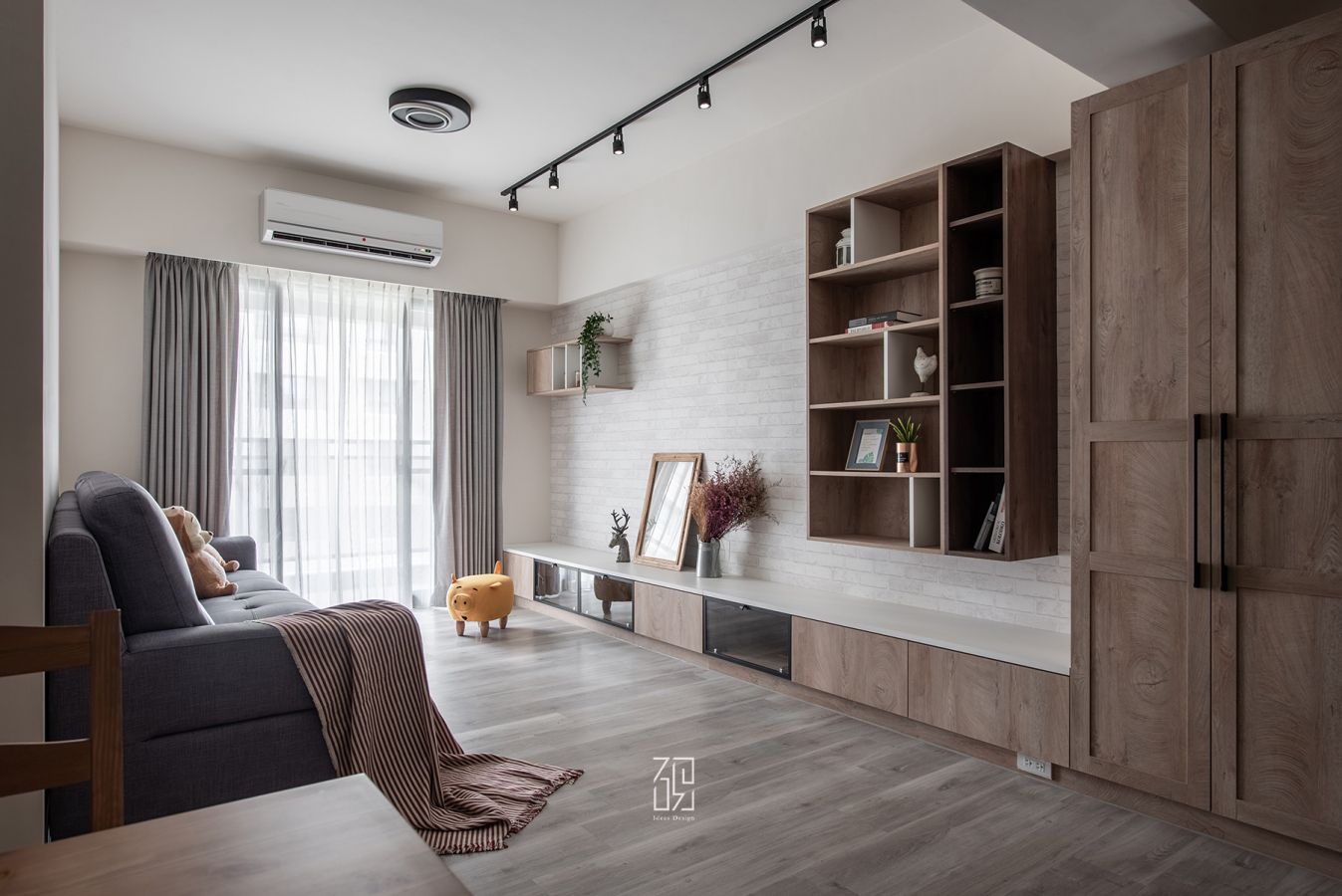 全室色調以淺木紋和淺灰色為基調,將簡約樸實的風格中帶出溫馨感受,設計師選擇使用超耐磨地板、乳膠漆、木皮和系統櫃打造視覺寬敞舒適的空間,整體以一致的色調貫穿室內,而在收納功能方面,以電視牆開放櫃等儲物空間、臥室衣櫃收納,打造美觀而實用的空間規劃。